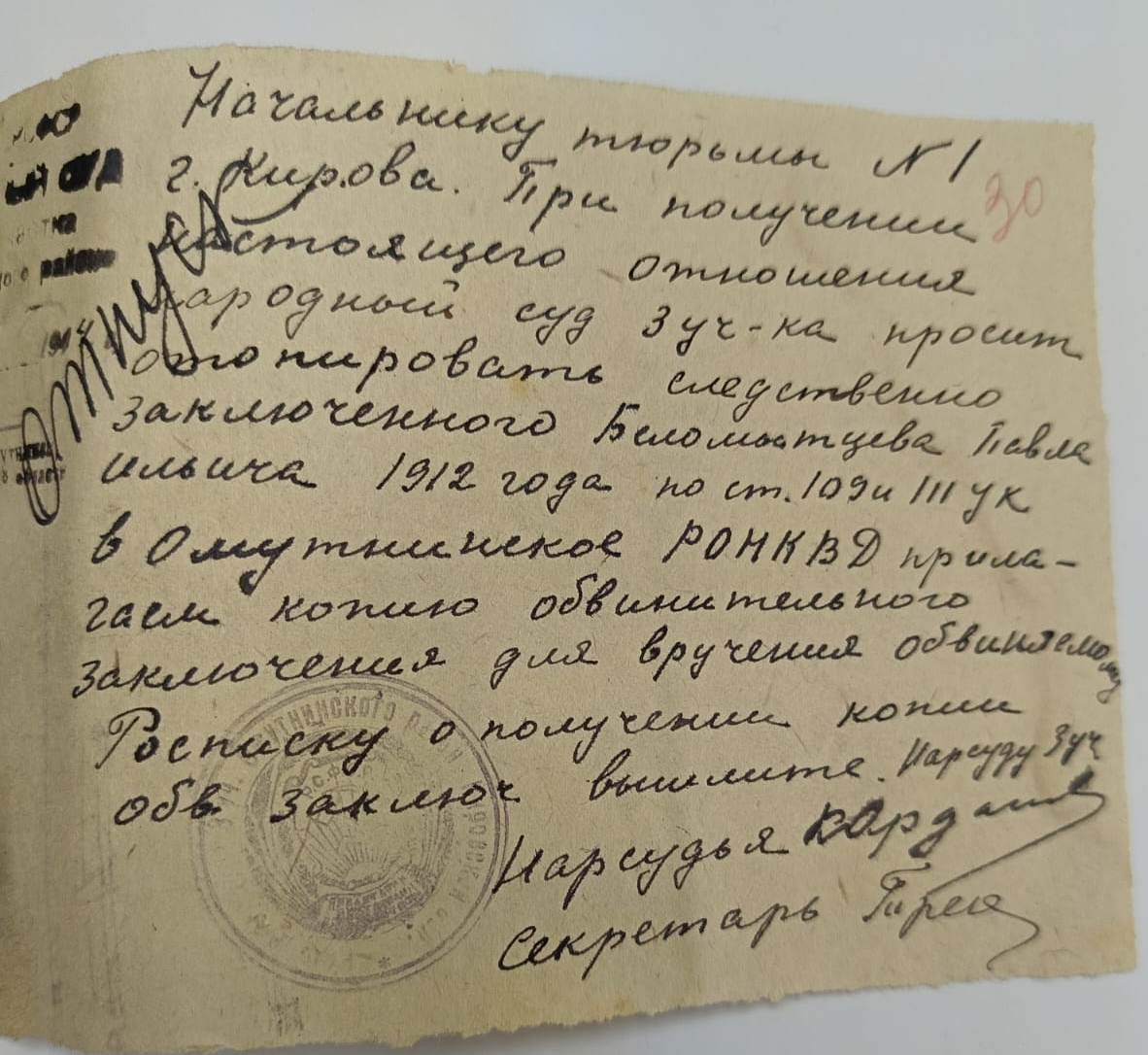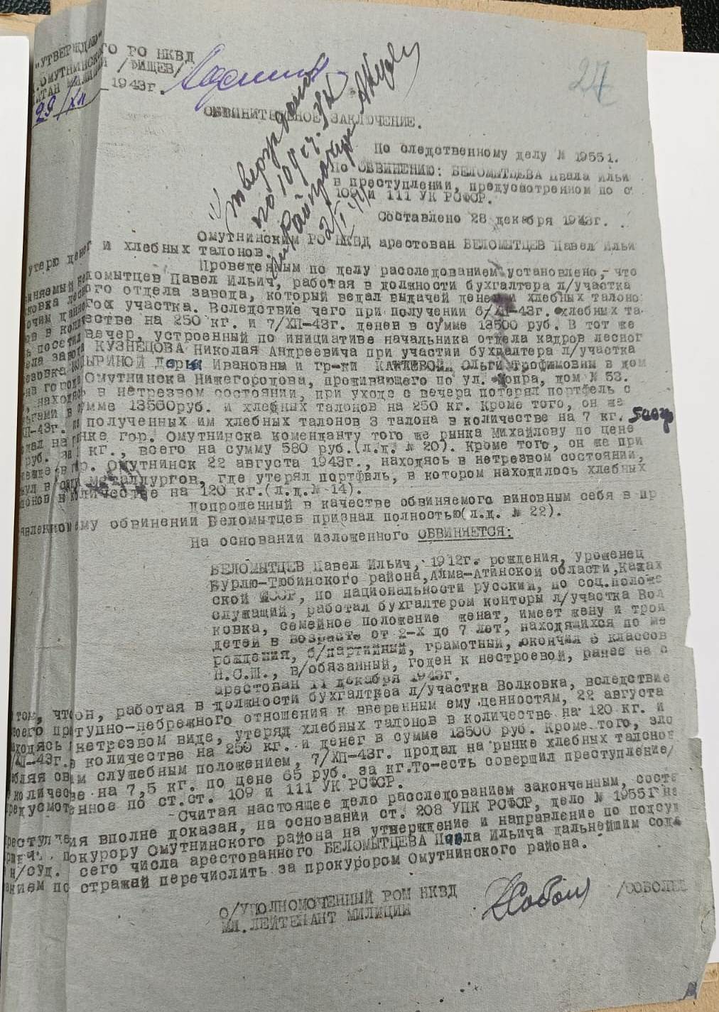 Продолжая тему корыстных преступлений, совершенных должностными лицами, остановимся на деле бухгалтера лесоучастка Волковка Беломытцева П.И. Беломытцев был ранее не судим, женат, имел на иждивении троих малолетних детей, работал бухгалтером и ведал выдачей денег и хлебных талонов рабочим лесоучастка. 06.12.1943 Беломытцев, получив для выдачи рабочим хлебные талоны на 250 кг хлеба, а также деньги в сумме 13500 рублей, в тот же вечер продал 3 хлебных талона на рынке г. Омутнинска за 580 рублей, после чего, употребив спиртные напитки в компании начальника отдела кадров лесного отдела завода и еще двоих бухгалтеров лесоучастка, потерял портфель с находящимися в нем деньгами и хлебными талонами. Ранее, 22.08.1943, Беломытцев, также находясь в нетрезвом состоянии, утерял хлебные талоны на 120 кг хлеба. За преступно-небрежное отношение к вверенным ценностям в условиях военного времени Беломытцев был осужден приговором народного суда 3 участка Омутнинского района Кировской области от 26.01.1944 к 8 годам лишения свободы с последующим поражением в избирательных правах на пять лет, с осужденного взыскано в пользу лесного отдела завода 13500 рублей утерянных денег и рыночная стоимость разбазаренных хлебных талонов - 37000 рублей. Продолжение следует …. ![]() ![]() |